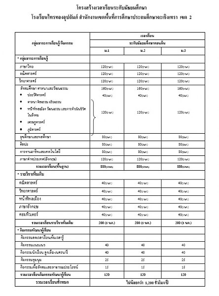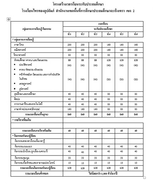 โรงเรียนไทรทองอุปถัมภ์ จัดสอนตามหลักสูตรแกนกลางการศึกษาขั้นพื้นฐาน พุทธศักราช 2551 โดยหลักสูตรสถานศึกษา โรงเรียนไทรทองอุปถัมภ์ ได้จัดสัดส่วนกลุ่มสาระการเรียนรู้ /รายวิชา/รายวิชาเพิ่มเติม กิจกรรมพัฒนาผู้เรียน และเวลาเรียน ดังตารางต่อไปนี้
